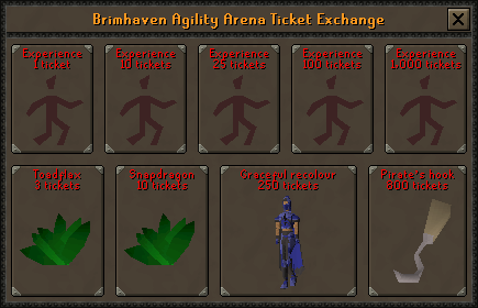 The Brimhaven Agility Arena Ticket Exchange is the rewards shop. This calculator attempts to optimize the trading of tickets for experience.